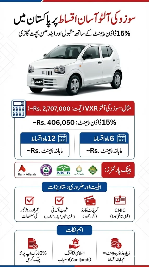 Suzuki Alto on Easy Installments 2026 offers a timely solution for aspiring car owners in Pakistan, where vehicle acquisition has become increasingly challenging amidst economic fluctuations. Owning a personal vehicle, particularly a fuel-efficient and reliable model like the Suzuki Alto, remains a significant aspiration for middle-class families. Recognizing this demand, new financing policies introduced in January 2026 by various banks aim to make car ownership more accessible, specifically targeting the popular Suzuki Alto with a remarkably low down payment option.